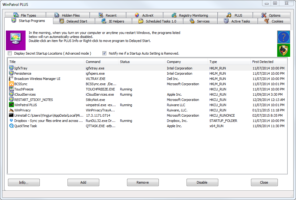 WinPatrol PLUS monitors and exposes adware, keyloggers, spyware, worms, cookies, and other malicious software. WinPatrol PLUS puts you back in control of your computer with no need for constant updates. WinPatrols goal is to help you understand what programs are running on your computer and to alert you to any new programs added without your permission.