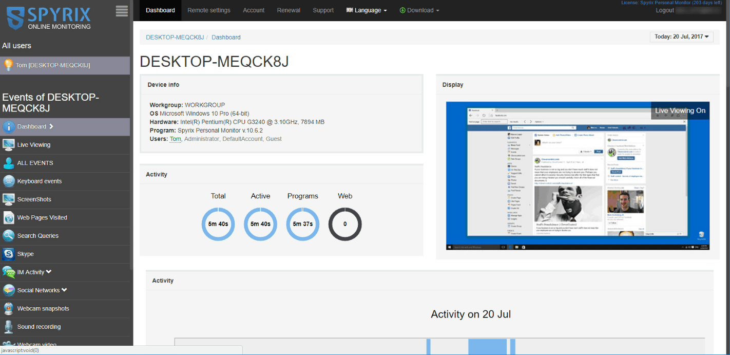 Monitor of all activities on your Windows PC: keystrokes (keylogger), passwords, screenshots, Facebook (include chat), Skype, Email, Chats, IMs. Get Spyrix Personal Monitor PRO includes full version license with 50% Off Coupon.